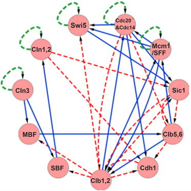 Figure 1. (Color online) Gene regulatory network of the cell-cycle of budding yeast [10] . Each circle represents a protein (cyclin or transcription factor) involved in the gene regulation. For the links connecting the respective proteins, the blue-solid lines represent the effect of the activation control, and the red-dashed lines represent the effect of the suppression control. In addition, the self-loops by green-dotted lines represent the effect (ubiquitin-proteasome system) of protein degradation in the absence of external input.