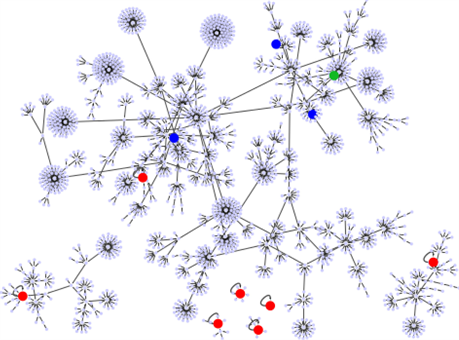 Figure 2. (Color online) The point attractors and the basin structures of the network . The 7 red circles present the common point attractors to and . The blue and green circles present attractors newly added by the network becoming . The poin attractor with the largest basin of is indicated by green circle.