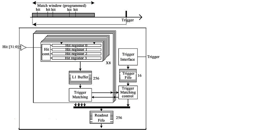 Figure 7. Sketch of the system used during the PSI beam test: hits storage occurred prior triggering, which has been properly delayed (top); the simplified Block Diagram of the Data Acquisition (DAQ) (bottom).