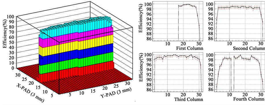 Figure 8. Single pad row efficiency for the full detector (left) and for each row (right) measured at the PSI beam facility. Each pad is ~3 × 3 mm2.