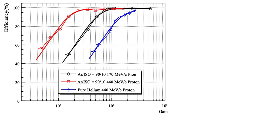 Figure 9. Detector efficiency as a function of the gain for 440 MeV/c proton and 170 MeV/c pion in Ar/i-C4 H10 gas mixture and pure helium measured at the PSI beam facility. The drift field is set to 0.4 kV/cm for all the measurements.