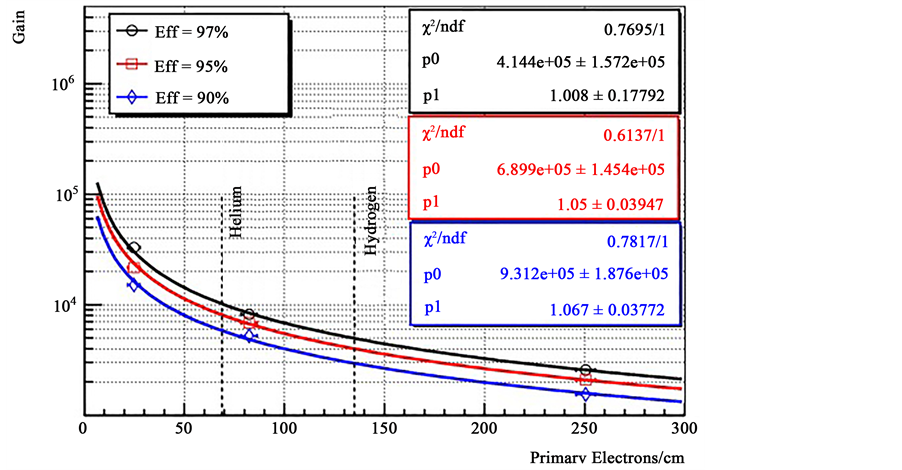 beam test, a full efficiency is reached with an isobutane-based gas mixture at lower gain, i.e. ~3 × 104 for protons and ~8 × 104 for pions, respectively, while for pure helium gas the maximum efficiency is ~97% before to reach the instability region. The points in Figure 9 are fitted with a negative exponential function1 in order to evaluate the gain at which the detector efficiency is 97%, 95% and 90%. These results have been plotted in Figure 10 as function of the primary ionization (simulated by GARFIELD) for 440 MeV/c proton and 170 MeV/c in Ar/i-C4 H10 (90/10) gas mixture and 440 MeV/c proton in pure helium gas (see Table 1). A function y = p0/xp1 has been used to fit the points of Figure 102 in order to estimate the gain, and accordingly the efficiency, for a 127 MeV/c kaon crossing the active target GEM-TPC filled with a pure helium or a pure hydrogen gases as foreseen in the AMADUES experiment. A suitable gain value of ~8 × 103 or 4 × 103 for a helium or hydrogen gases (vertical dotted lines), respectively, will allow to reach a detection efficiency of ~95% and to operate the detector in stable condition.