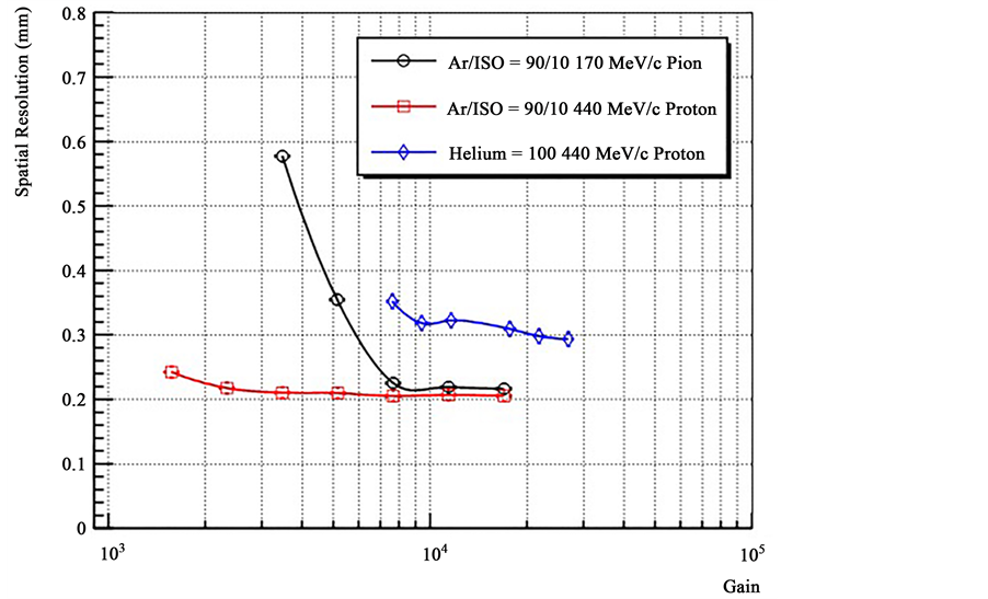 Figure 11. Spatial resolution as a function of the gas gain for proton of 440 MeV/c and pion of 170 MeV/c in Ar/i-C4 H10 gas mixture and pure helium measured at the PSI beam facility. The drift field is set to 0.4 kV/cm for all the measurements.