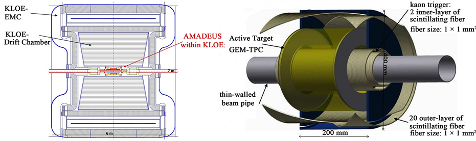 Figure 1. Cross-section of the KLOE detector including the AMADEUS inner setup inside the Drift Chamber (left) and the dedicated AMADEUS setup (right). From the beam pipe to the outer region: the Kaonic Trigger, the active target GEM- TPC.