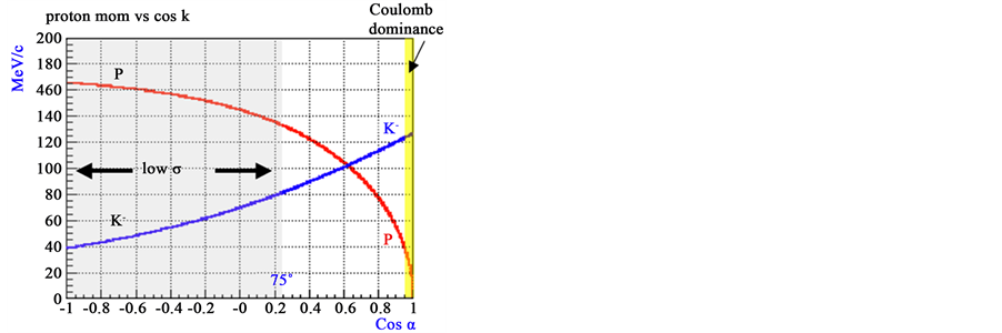 Figure 2. Kinematics of the K− p elastic scattering: the blue curve shows the momentum of the emitted kaon versus the cosine of the angle between the incident kaon direction and the emitted one. The red curve shows the kinematics of the associated proton.