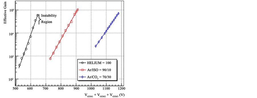 The effective gain of a triple-GEM detector has been measured for different gas mixtures and pure helium using a high intensity 5.9 keV X-ray tube. Gain value is obtained from the ratio of the pad current (with high voltage on the GEM foils) to the current on the first GEM (with no high voltage on the GEM foils). As shown in Figure 5, operational instability has been observed only for the pure helium gas at a gain greater than ~3 × 104 due to the absence of a quencher in the gas.