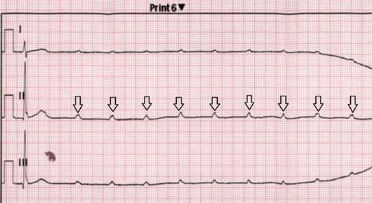 Figure 1. Strip ECG shows Prolonged Non-Conducted P waves (black Arrows) indicate complete atrioventricular block.