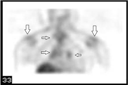Figure 3. Gallium PET scan showed multiple foci of increased uptake on mediastinum and axillae (black arrows).