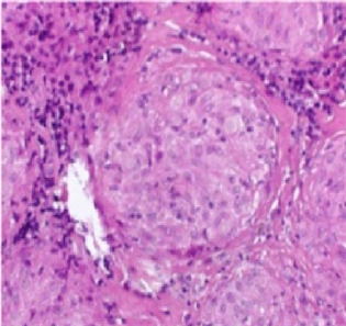 Figure 4. Mediastinal Lymph node biopsy indicate noncaseating epithelioid cell granulomas (center of image) of sarcoidosis (H & E staining).