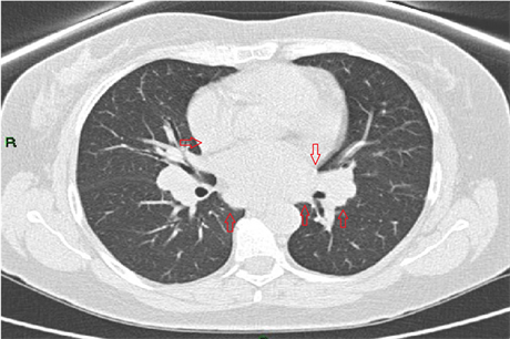 Figure 5. CT scan of the chest showing bihilar and mediastinal lymph nodes enlargement (red arrows).