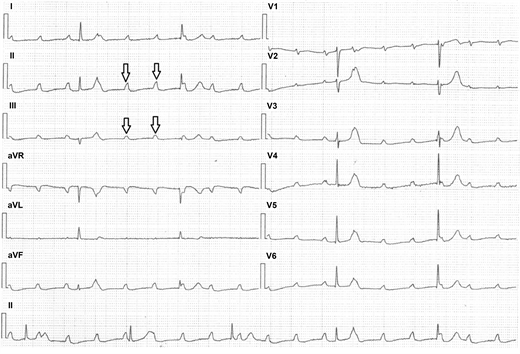 Figure 6. Leads ECG show multiple non-conducted P waves (black arrows) with ventricular escape rhythm indicate complete atrioventricular block.