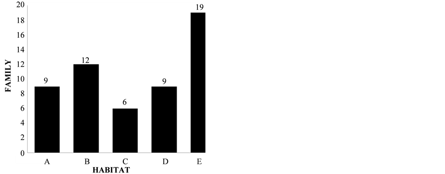 Spiders are obligate predators of herbivorous insects and they are capable of reducing insect populations that may not be limited by competition and food availability in some agroecosystems [12] [13] . Several studies have shown that insect populations significantly increase when released from predation by spiders. Spiders as predators, are not attached to a particular plant species as a food source, therefore vegetation structure is an important determinant of spider community attributes. In Nigeria however, there are relatively low data on diversities of spider and there is a need for further study on the richness of diversity of spider. Ayansola [14] studied diversity of foliage spiders in two contrasting habitats in rain forest zone of Southwestern Nigeria and his study suggested possible effect of habitat characteristics on the occurrence and diversity of foliage spider species. This present study of ours is therefore aimed at documenting the distribution and diversity of spiders in five different habitats with a view to estimate the influence of habitat structure on diversity of spider in the area of study. This is the first known report on the diversity and distribution of spider’s fauna covering five different habitats in Southwestern Nigeria. The information gained on the diversity and distribution of spiders elucidated in this study will play an important role in the management of spiders and related pests in the study area.