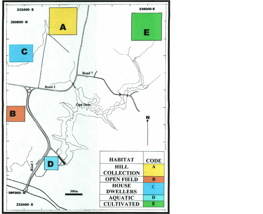 The study was carried out on the campus of Obafemi Awolowo University (7˚31'N and 4˚31'E). The university is located at Ile-Ife in Osun State of Nigeria as shown in Figure 1. The survey covered five different habitats in Southwestern Nigeria, the first habitat, hill I representing hill collection and it was depicted as A in Figure 2, The second habitat, open field was depicted as B in Figure 2. The third habitat, hall of residence representing house dwellers and it was depicted as C in Figure 2. The fourth habitat, dam representing aquatic habitat and it was depicted as D in Figure 2. The fifth habitat, teaching and research farm representing cultivated area was depicted as E in Figure 2. The university is in the lowland forest zone according to [15] , semi-deciduous moist forest [16] and [17] described as Guinea-Congolian forest, drier type. The dry nature of the Ile-Ife forest is demonstrated by the fact that wherever the soil is shallow, as on the slopes of inselbergs, humid savanna vegetation develops [18] . The university campus occupies an area of 5600 hectares of which the built-up, central campus and the university farms occupy 3349 hectares. As at 1985, regrowth forest, most of it around two (hills I and II) of the three inselbergs on the northwestern corner of the central campus, occupied an estimated 1234 hectares.