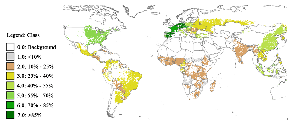 Figure 1. Ratio of actual to potential yield for Maize (Year 2000) [9] .