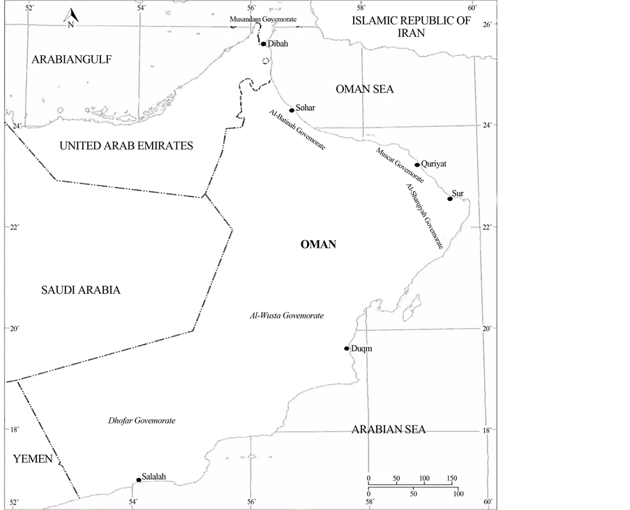 The Sultanate of Oman is located at the south-eastern corner of the Arabian Peninsula between latitudes 16˚40' and 26˚20'North and longitudes 051˚50' and 059˚40'East and has a coastline of about 3165 km. It is bordered by three different water bodies: the Arabian Gulf, the Sea of Oman and the Arabian Sea (see Figure 1).