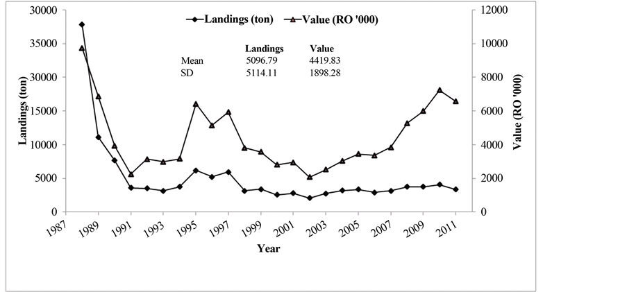 Figure 2 presents landings and gross value of landings of kingfish for the period 1988-2011. It is found that the landings of kingfish had experienced a considerable decline (about 88%) during the period 1988 to 2011.