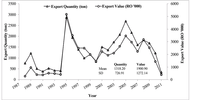 In the domestic market, kingfish is generally marketed whole and un-gutted. It is generally sold locally at landing sites or transported to local market places using refrigerated and non-refrigerated trucks. Kingfish is also exported to the Gulf Cooperation Council (GCC) countries. Statistical evidence suggests that the United Arab Emirates (UAE) and Saudi Arabia are the top export destinations (about 99.7% of the total export quantity in 2011) [25] . Hence, kingfish plays an important economic role in foreign exchange earnings. Figure 3 presents the export quantity and total value of kingfish for the period 1988-2011.
