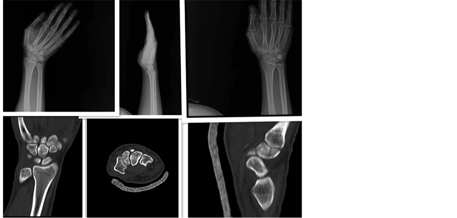 Figure 1. Left hand AP; Left hand scaphoid view; Left hand lateral; Left hand axial CT (triquetrum fracture is observed); Left hand coronal CT; Left hand sagittal CT.