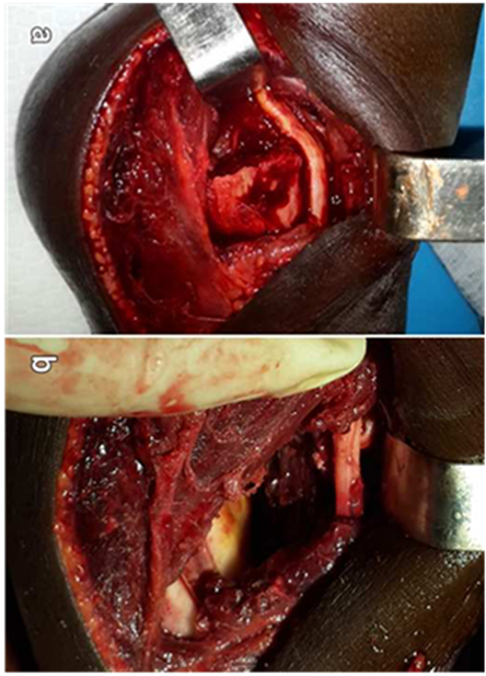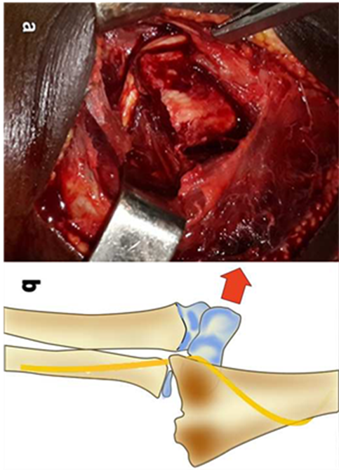 Figure 4. Per-operative images showing the radial nerve extrication (a) and the fracture reduction (b).