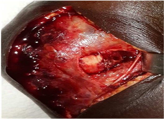 The next day, a reevaluation was made. Radial and ulnar pulses were present and symmetrical. It was a falling hand and a loss of active extension of thumbs. We found also a hypoesthesia of the dorsal side of hands. It was no deficit of median and ulnar nerves. The nervous lesion and the importance of fractures displacements motivated an open reduction and internal fixation (ORIF). The third day, under general anesthesia, a surgical exploration was performed by a medial approach. We found a musculoaponeurotic breach of the brachialis and lateral epicondylar muscles (Figure 2). A continuous radial nerve (RN) was found entrapped in fracture site (Figure 3). RNwereextricated softly with help of external maneuvers such as supination and flexion of elbows. Liberated nerves were contused with an intact perineurium (Figure 4). Fractures were reduced and fixed by two crossed K-Wires (Figure 5). The post-operative period was uneventful. Sensitivity recovered at seven months and motricity at 11 months. No electromyography was done by indisponibility. K-Wires were removed at three months.