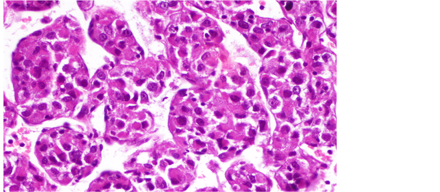 Figure 2. Alveolar nests of tumor cells separated by thin fibrous septae.