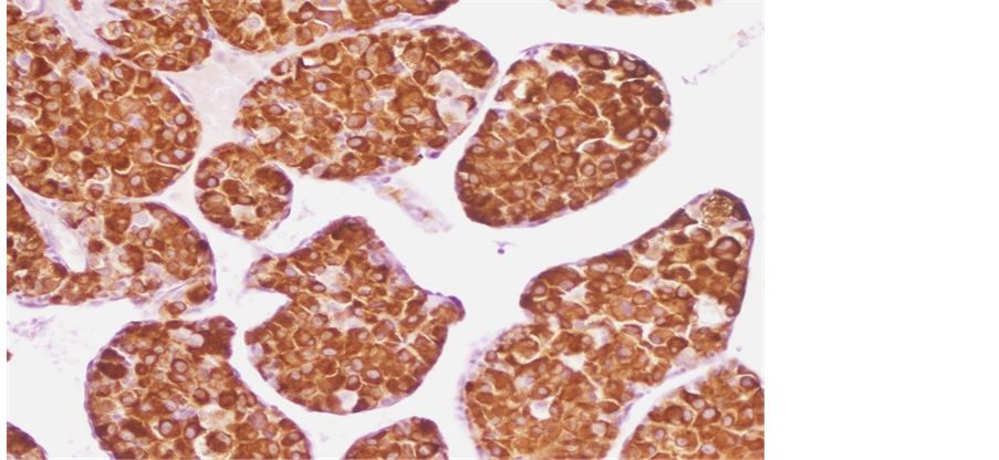 The most characteristic finding in ASPS is the consistent demonstration of strong nuclear immunoreactivity for TFE3, reflecting the ASPSCR1-TFE3 fusion gene that had been identified by cytogenetic analysis [4] [14] . Recent studies have shown that the crystals are immunoreactive to a protein MCT1 (monocarboxylate transporter) and to CD 147 [15] . About 50% of ASPS tumors express Desmin, as our case showed. Staining for protein S100 can be positive. Generally, epithelial, melanocytic, neural, glial, and neuroendocrine markers are negative [14] [16] .
