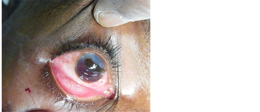 The seat of the injury was zone I in 85.71% and zone II in 14.29%. Ocular traumas were all unilateral of which 7 cases on the right eye and 13 cases on the left eye. Lesions associated were dominated by iris prolapse with 7 (35%) cases of variable scale (Figure 1), post traumatic cataract that quickly grow in 6 (30%) cases and the hyphema in 4 (20%) cases mostly associated to the iris prolapse (Table 3).