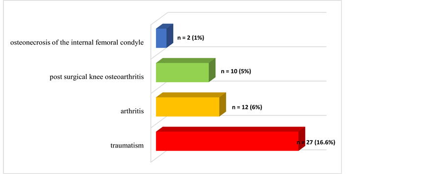 spectively 6% and 5% of cases. About co morbidities, arterial high blood pressure was the main cardiovascular factor associated to knee osteoarthritis, found among 106 patients (53%), followed respectively by diabetes mellitus and consumption of alcohol in 28.5% and 28% of cases. The tobacco addiction was associated in 12% of cases. 114/158 women in our series (72.15%), were post menopausal at the time of knee osteoarthritis diagnosis, with an average length of menopause at 9.6 years. Pain was the main call sign. It came with a lameness in 90.5% of cases (n = 181), crunch in 87.5% (n = 175) and avoidance in 27.5% of cases (n = 55). Clinical pain location was more frequently bilateral (54%). We found a genu varum deformity in 58.7% of cases (n = 108), genu valgum in 40.1% (n = 65) and synovial fluid in 30.5% of cases (n = 61). On x-ray, lesions were bilateral in 66.5% of cases and one-sided in 33.5% of cases. According to the Kellgren and Lawrence criteria, lesions were at stage 2 in 41.5% of cases, stage 3 in 21.7% and stage 4 in 2.8% of cases. One compartment was involved in 53.7% of cases, two compartments in 38.3% and three compartments only in 6.9% of cases. The functional evaluation by Lequesne pain functional rate was more than 8 on 50% of patients. It was considered as important in 43% of cases, very important in 27% and extreme in 8% of cases. Obesity was the most factors often associated. Indeed 54.7% of obese patients had a Lequesne pain functional rate superior to 11. The knee osteoarthritis was mainly secondary. The secondary shapes represented 81% of cases against 19% of primitive knee osteoarthritis. The main etiologic factor of secondary knee osteoarthritis was axial deviations, presented on all of our patients. The other etiologic factors are represented in Figure 1.