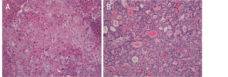 Figure 3. (A) Mediastinal lymph node: microscopic findings showed sheets of large tumor cells. The tumor cells showed no microscopic features of differentiation toward either adenocarcinoma or squamous cell carcinoma; (B) Gastric cancer: the tumor contained well-defined glandular structures with tubules.
