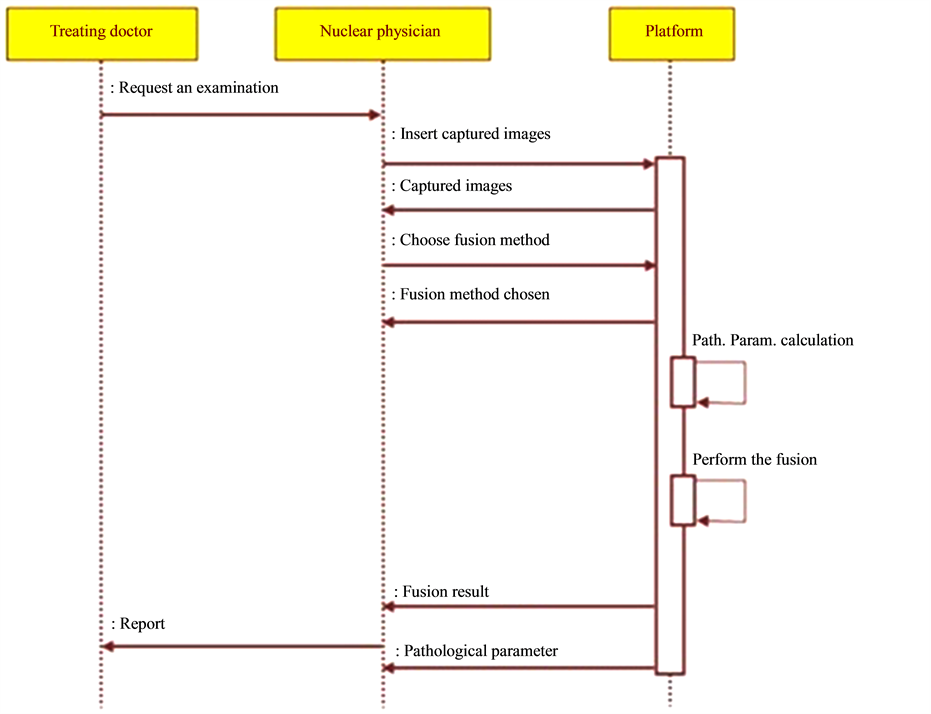 According to the UML formalism, the first phase of modelling consists in identifying the various actors interacting with the platform [19] -[21] . In our application it is the nuclear physician and the prescribing doctor. To better understand the succession of actions over time and the temporal constraints of the interactions between the actor and the platform, we have established a sequences diagram (Figure 5). This diagram is based on the usual scenario followed in such cases. Indeed the treating doctor suspecting the anomaly in the patient directs him to the nuclear physician. The latter makes scintigraphic images and introduces the acquired images in the file as they will be later explained. Then he chooses a fusion method from the selection that appears. The calculation of the pathological parameter is then activated and the fusion is carried out by the platform. These results enable him to write a report and to return it to the treating doctor.