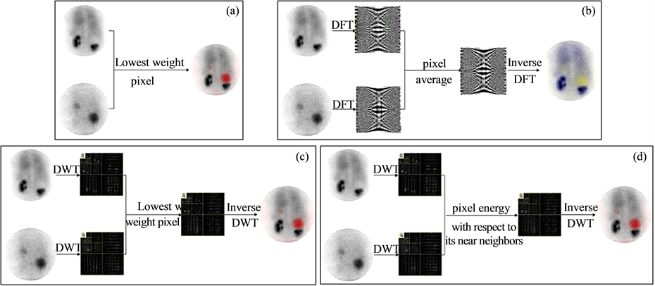 The computational part supports image processing methods for fusion and calculation of pathological parameter. In the studied case, there is a large size, which is easy to distinguish from the dysplasic kidney. However, it will be interesting to investigate cases where the cyst is small for an early diagnostic of the pathology. In this case, it will be difficult to differentiate the cyst from the dysplasic kidney. Therefore, it is necessary, considering the variety of cysts (benign or malignant), to develop different fusion procedures in several domains (spatial, frequency, multi-resolution). This will provide more flexibility to the platform. So, we have established a library of fusion methods to offer to the users of the platform the opportunity to choose the appropriate fusion procedure [22] -[30] . The four proposed methods of image fusion are: fusions in the spatial domain, fusion in the frequency domain, standard fusion in the multi-resolution domain and global energy fusion in the multi-resolution domain (Figure 6).