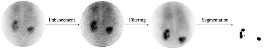 As mentioned earlier, the renal cyst affects renal function which necessarily implies a remarkable gap between the functionality of the dysplasic kidney and that of the normal kidney. The study of the variation of the activity in each kidney is used to evaluate this gap. Pathological parameter describes this gap by assessing variation in average activity per pixel as a function of time. First, the pathological parameter calculation requires, above all, proceeding by a segmentation operation, facilitated by a step of enhancement and followed by a filtering operation (Figure 7) [31] . Second, it comes to calculate the average values of pixels in the kidney area for both left and right kidneys for different dates of acquisition, then normalize the values of the first acquisition for each kidney, and finally interpolate the average values for both kidneys to visualize the evolution over time of the respective kidney activities and finally calculate the area between the two time evolution curves (that’s why we propose, in this case, to do a dynamic double-isotope scintigraphy). The value of the area between the two curves is used to describe the operating discordance rate between the dysplasic and the normal kidney (Figure 8). This amount explaining the effect of the renal cyst on the dysplasic kidney will be called “pathological parameter”.