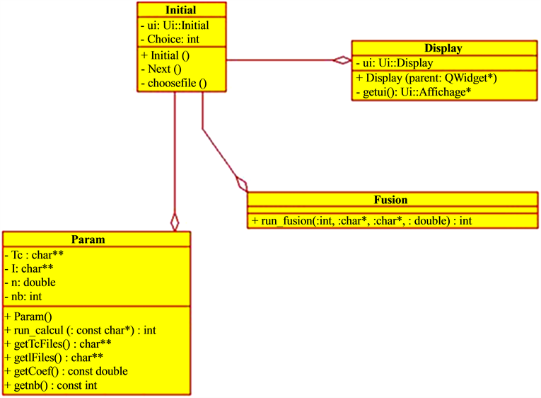 The application design is based on several images, at the entry, which will undergo different processing operations and calculations. It starts by designing a class “Param” that calculates the time parameter, then another class “Fusion” taking charge to make the image fusion operation, and then a class “Display” that displays the final result (Figure 9). This application is designed while minimizing the dependencies between modules (Figure 9).