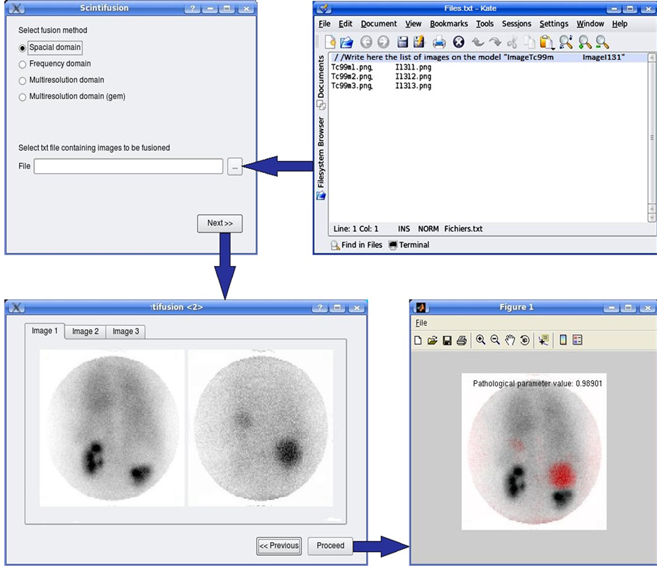 The platform gives the user a list of different methods of fusion (Figure 10). It also gives him the possibility to select the file containing the names of scintigraphic images that will undergo fusion. This file must follow the format as shown in Figure 10. Once these two choices are made, it is for the user to press after allowing it to access the subsequent screen. The latter is described in detail below in Figure 10.
