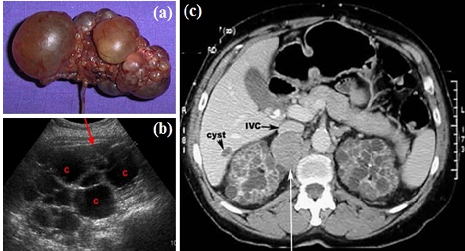 Figure 1. Renal cyst. a) polycystic kidney; b) echography of a polycystic kidney; c) CT of polycystic kidney.