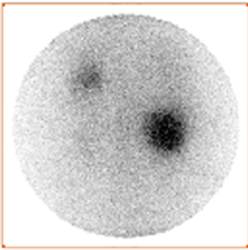 Scintigraphy is a functional imaging, in addition to the revelation of the existence of renal cyst, it can tell us about the functioning status of the dysplasic kidney [1] -[3] [14] [15] . As observed in scintigraphic images, there are two very different formations: cyst (Figure 2(a)) and kidneys (Figure 2(b)). The strategy is to reveal everyone by a different acquisition protocol and to avoid motion artefacts and the use of image recalling better fusion results. Thus, image acquisitions must be performed simultaneously. The solution is the dual-isotope acquisition. Then, we obtain for each time t a couple of images (Figure 3), one showing the kidney and the other revealing the renal cyst.