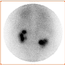 Figure 2. Simultaneous dual-isotope acquisitions: a) acquisition with iodine-131 revealing the cyst; b) acquisition with Technetium-99 m revealing the kidneys.
