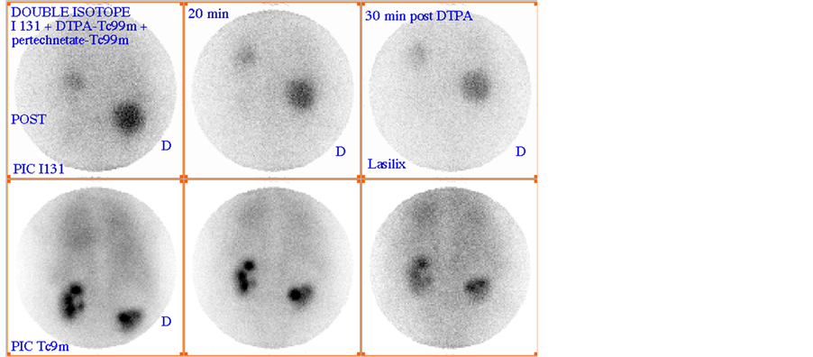 The case studied is a patient with hyperthyroidism and following a systemic metabolic radiotherapy with iodine-131 and in whom is suspected a renal pathology that was analyzed by scintigraphy with technetium-99 m. Then, two solutions were administrated to the patient; a solution of Sodium iodine-131 (NaI-131) [16] and a solution of diethylenetriaminepentaacetic acid Technetium-99 m (DTPA-Tc-99m) [16] [17] . In this case, while the kidney function would be tested by the kinetic of accumulation and excretion of the DTPA-Tc-99 m [2] [3] , the cyst would fix the NaI-131[1] . The dual isotope acquisition showed the presence of renal cyst and kidney functions. An adequate fusion of the two images can approach its location relatively to the dysplasic kidney and its influence on its functioning.