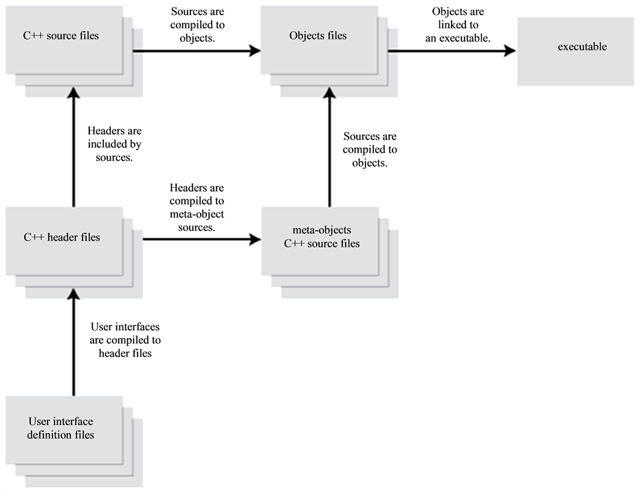 Moreover Kdevelop directly integrates graphics libraries KDE/QT in its interface. QT Designer permits the creation of visual interfaces (what you see, what you get). The interfaces are directly integrated as xml file to the current project under Kdevelop. Figure 4 explains the principle of deploying a developed GUI using QT Designer to communicate with the application developed in C++ [18] .