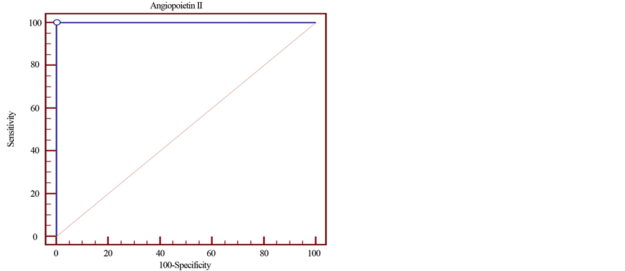 Table 6, Figure 4 show the cut of point, sensitivity and specificity of Angiopoietin-2 as an early marker for diagnosis of cardiovascular risk in children on hemodialysis; it revealed: the cut of point of Angiopoietin-2 is 43 ug/ml with 100% sensitivity and specificity in the prediction of cardiovascular risks in children on hemodialysis.