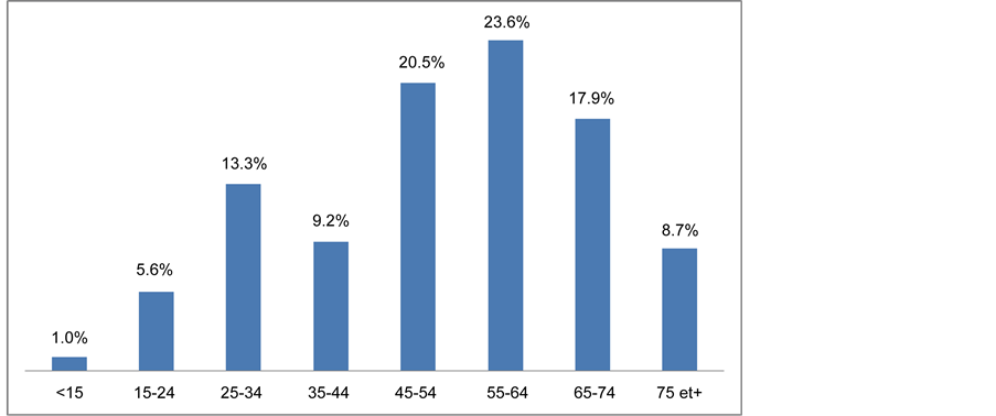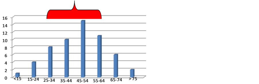 The average age was 51.8 ± 16.8 years and extreme ranging from 11 years to 85 years. The age group between 45 to 64 years accounted for 44.10% of all cases. Distribution according to ages is summarized in Figure 1.