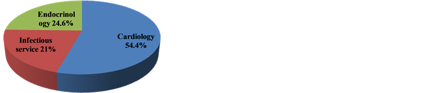 We noted that 54.4% of patients were hospitalized in cardiology as shown in Figure 2.