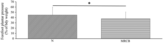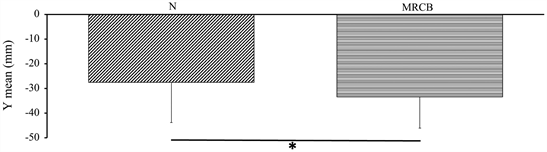 Statistical analysis shows a significant backward displacement 20% of global CoP in the MRCB condition relative to the control condition (p < 0.01) (Figure 1(a)). However, no significant differences have been found between the position of CoP of each foot (YRF, YRL). FPP was 15% lower in the MRCB condition than in the control condition (p < 0.01) (Figure 1(b)).