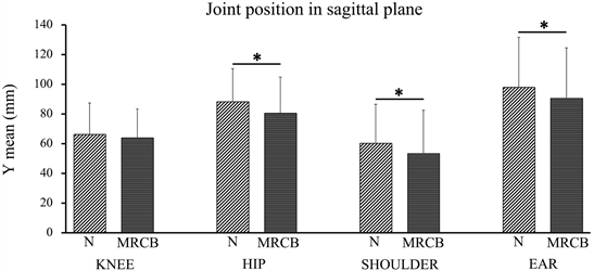 Figure 2. Position of the joints of the knee, hip, shoulder and head with respect to the ankle in the sagittal plane with the wearing of the neutral sole (N) and the orthopaedic sole (MRCB) (*: p < 0.01).