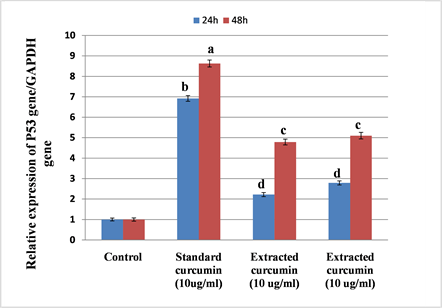 Figure 6. Graphical presentation of real-time quantitative PCR analysis of the expression of P53 gene in HepG2 cells after administration of curcumin for 24 h and 48 h. The results are present as the mean ± standard deviation of three independent experiments. Means within the same column carrying different superscript letters are significantly different (p ≤ 0.05) all groups versus the control group.
