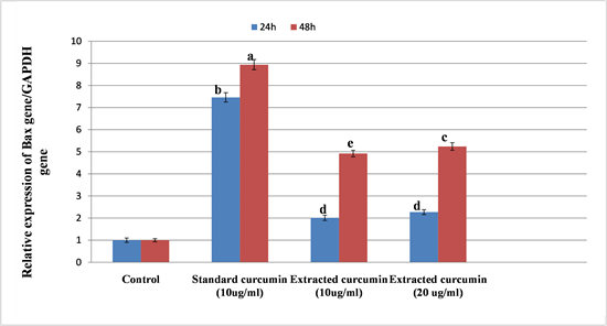 Figure 7. Graphical presentation of real-time quantitative PCR analysis of the expression of Bax gene in HepG2 cells after administration of curcumin for 24 h and 48 h. The results are present as the mean ± standard deviation of three independent experiments. Means within the same column carrying different superscript letters are significantly different (p ≤ 0.05) versus the control group all groups versus the control group.