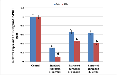 Figure 9. Graphical presentation of real-time quantitative PCR analysis of the expression of Bcl2 gene in HepG2 cells after administration of curcumin for 24 h and 48 h. The results are present as the mean ± standard deviation of three independent experiments. Means within the same column carrying different superscript letters are significantly different (p ≤ 0.05) all groups versus the control group.