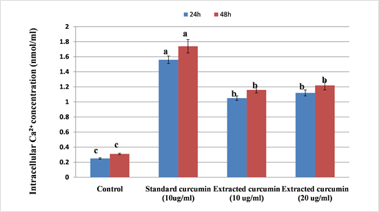The significant (p ≤ 0.05) decrease in the intracellular concentration of Ca2+ in HepG2 cells of control groups was illustrated in our data. This reduced expression was significantly elevated after administration of curcumin at a dose of 10 ug/mL when applied for 24 h and 48 h as compared to the control group. In general, the standard curcumin showed a significant higher Ca2+ concentration than that of the extracted curcumin with better results at 48 h than 24 h. However, no significant difference in the Ca2+ concentration was shown in treatment with a low dose (10 ug/mL) and high dose (20 ug/mL) (Figure 10).
