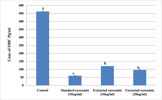 Figure 4. Effect of curcumin on ODC concentration in HepG2 cells. Means above the columns carrying different superscript letters are significantly different (p ≤ 0.05).