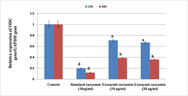 Figure 5. Graphical presentation of real-time quantitative PCR analysis of the expression of OCD gene in HepG2 cells after administration of curcumin for 24 h and 48 h. The data are present as the mean ± standard deviation of three independent experiments. Means within the same column carrying different superscript letters are significantly different (p ≤ 0.05) all groups versus the control group.